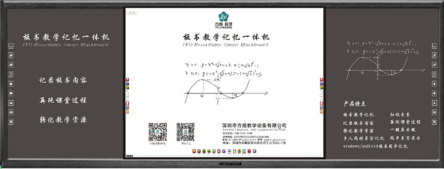 方成教學板書教學記憶一體機改變了智慧教學設備只能書寫無法記憶與同步顯示的不足,呈現了超大區域純平面展示,板書即時書寫,即時保存,亮屏便是板書原筆跡同步顯示,五指熄屏便是超大的粉筆書寫區域,老師不用擔心板書寫不下更不用擔心板書誤擦除后不見,實時再現課堂過程;