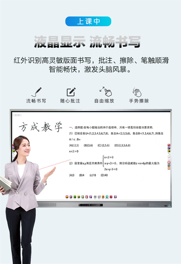 超窄邊多媒體教學(xué)一體機(jī)-超窄邊框三等邊超窄邊框設(shè)計(jì),推拉門鎖保護(hù),4K超高清顯示,以人機(jī)交互的方式,搭載互動(dòng)白板和無線投屏軟件,實(shí)現(xiàn)多人書寫、互聯(lián)互通的互動(dòng)教學(xué)模式,豐富課堂內(nèi)容,提高學(xué)習(xí)氛圍。