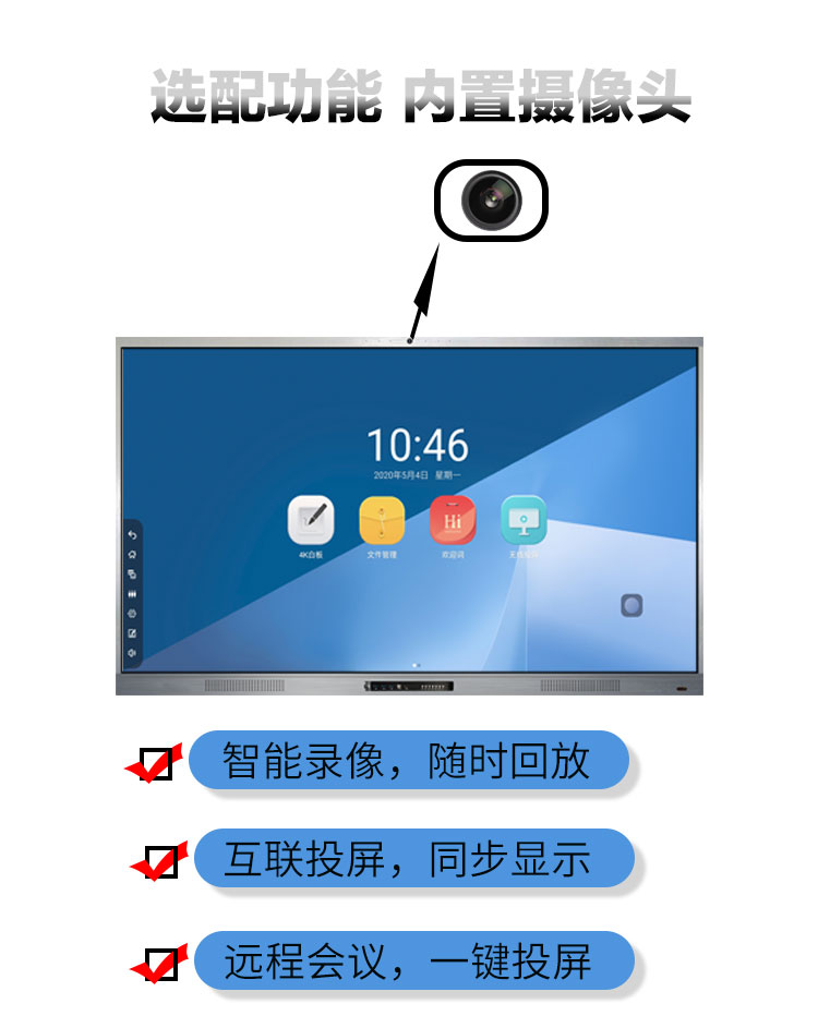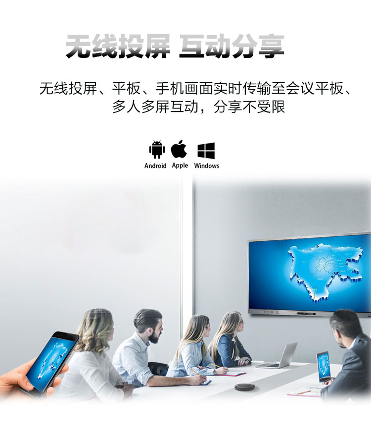 5、時(shí)尚精簡外觀,會(huì)議一鍵啟動(dòng)(這條特點(diǎn)針對(duì)于S款不帶推拉門的會(huì)議平板一體機(jī),主要應(yīng)用在會(huì)議場所用)